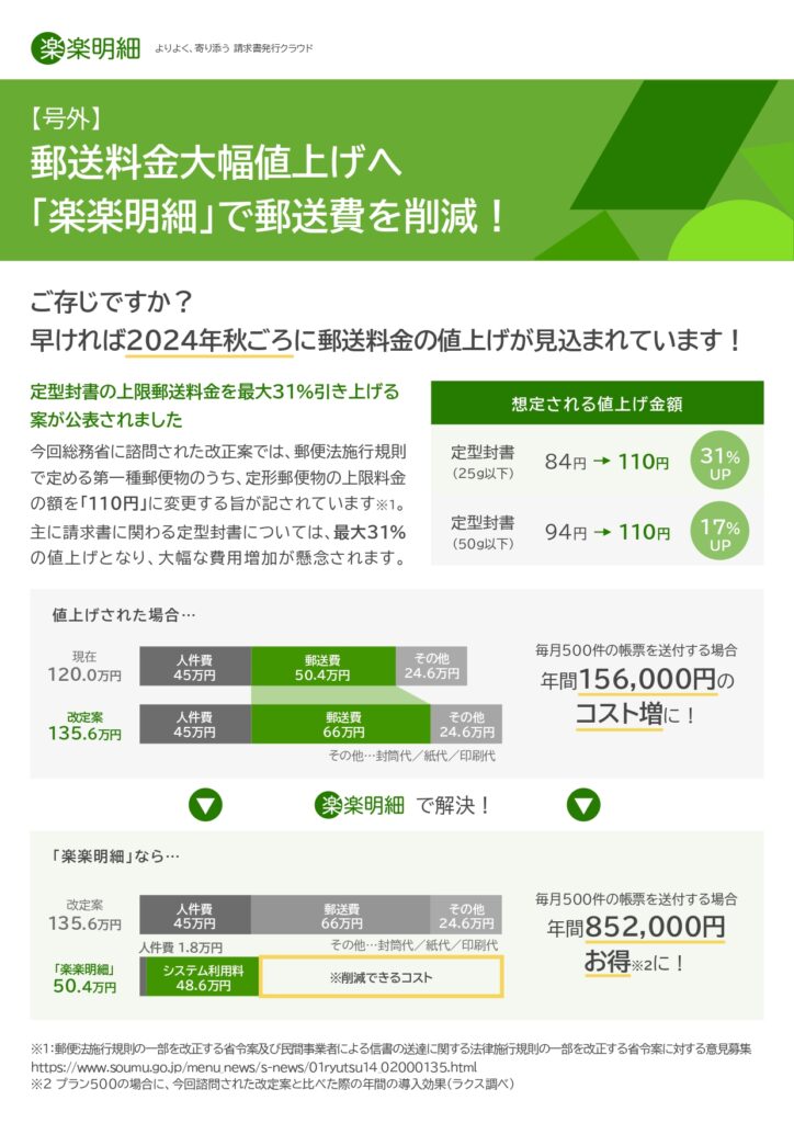 郵便料金の値上げ前に、「楽楽明細」でコストと手間のダブル削減をしませんか?